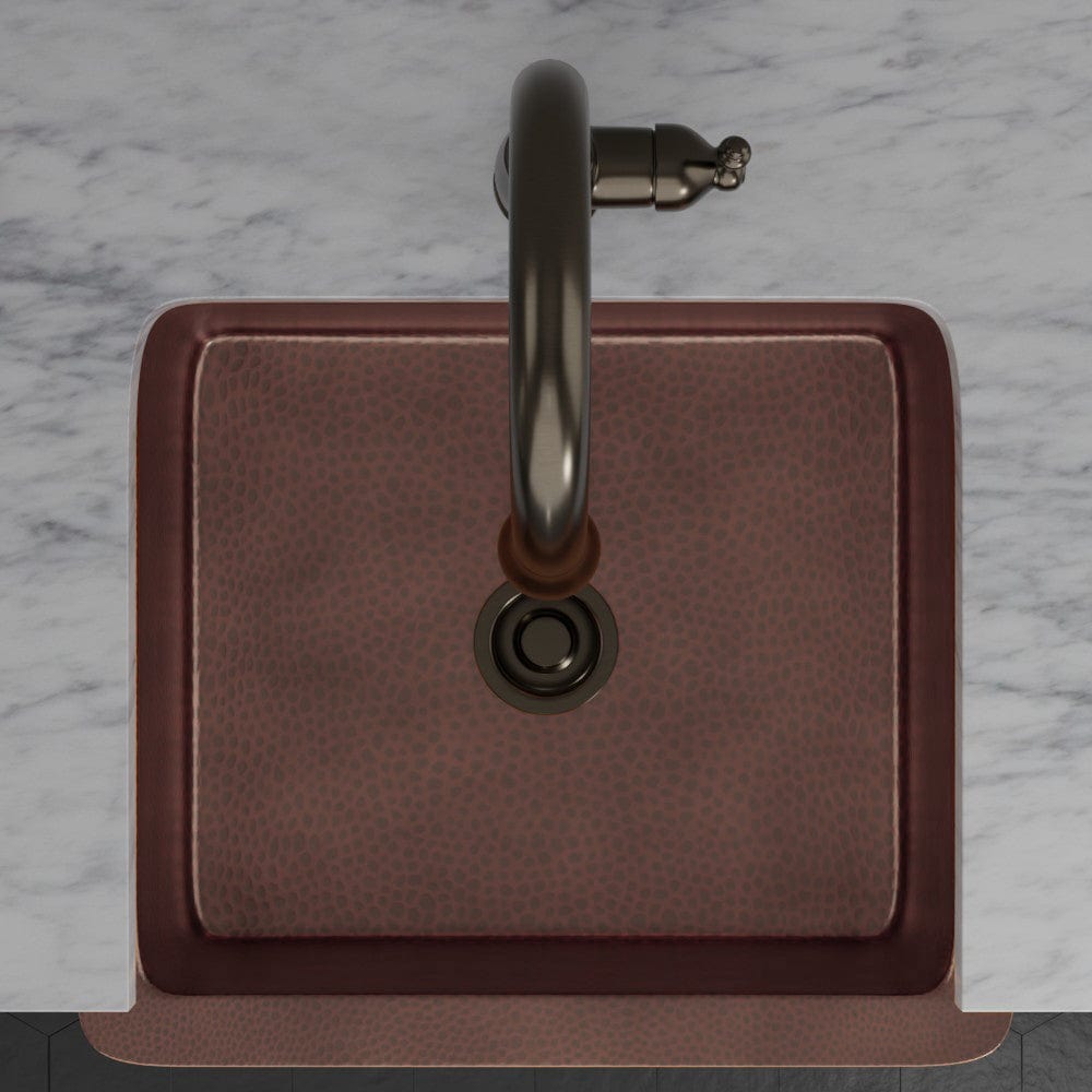 The 25" Verdin Single Bowl Hammered Copper Farmhouse Sink combines compact functionality with artisan craftsmanship. Featuring a rich antique copper interior and a contrasting dark copper exterior, this sink adds warmth and character to any kitchen design.