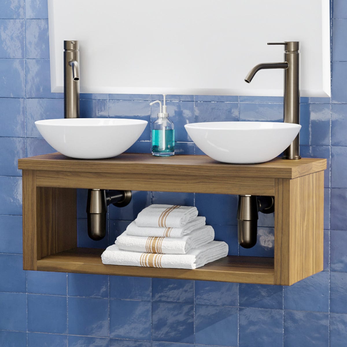 30" Thanesta Teak Wall-Mount Double Vessel Sink Vanity with Shelf - Natural Teak