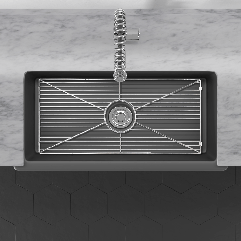 The design of this fireclay kitchen sink features a spacious single bowl and a glossy black finish. Easy to clean and maintain, the sink should become a focal point of any room. The product was fashioned in an old Italian village renowned for ceramics found in royal palaces.