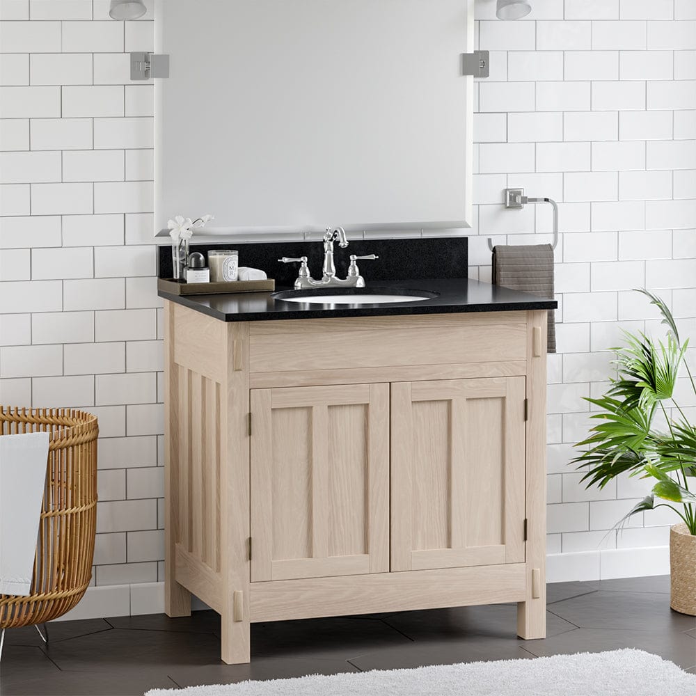 (833) 482-6828Manufactured from red oak and built in the USA, these stunning unfinished vanity cabinets are the very essence of functionality and style. These feature anti-skid pads underneath, ample storage space and well-constructed doors. Select an optional vanity top in one of several finishes to customize your look.