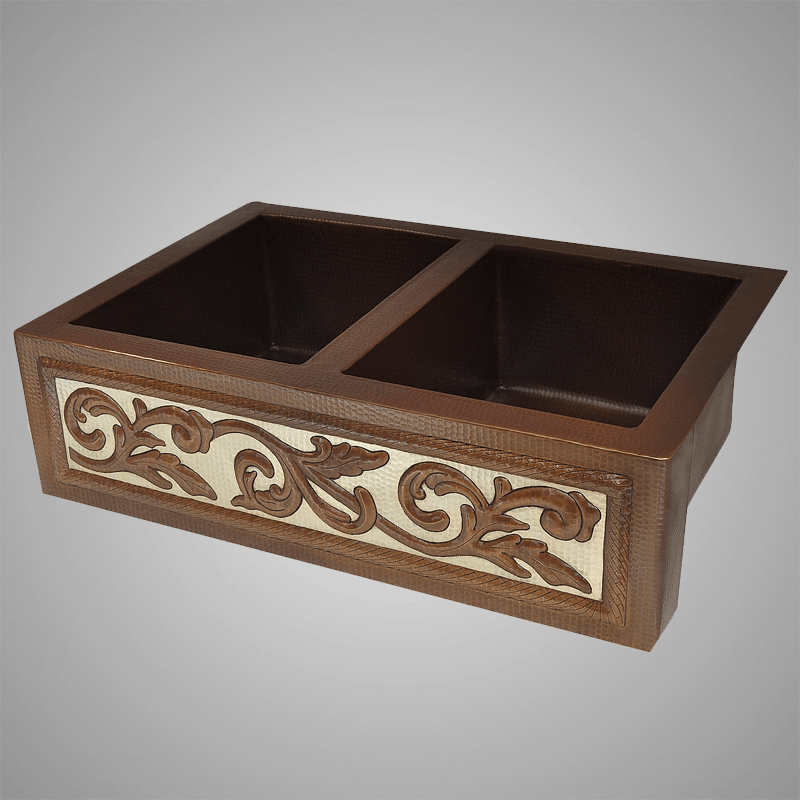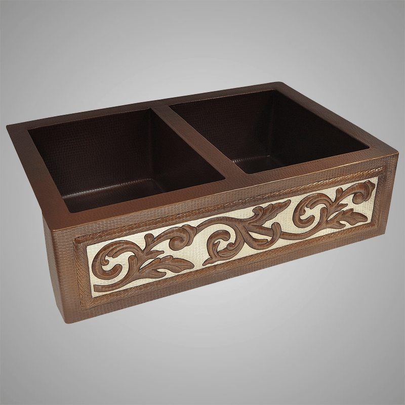 33" Garken Hammered Copper Double-Bowl Farmhouse Sink - Silver Vine Apron Design