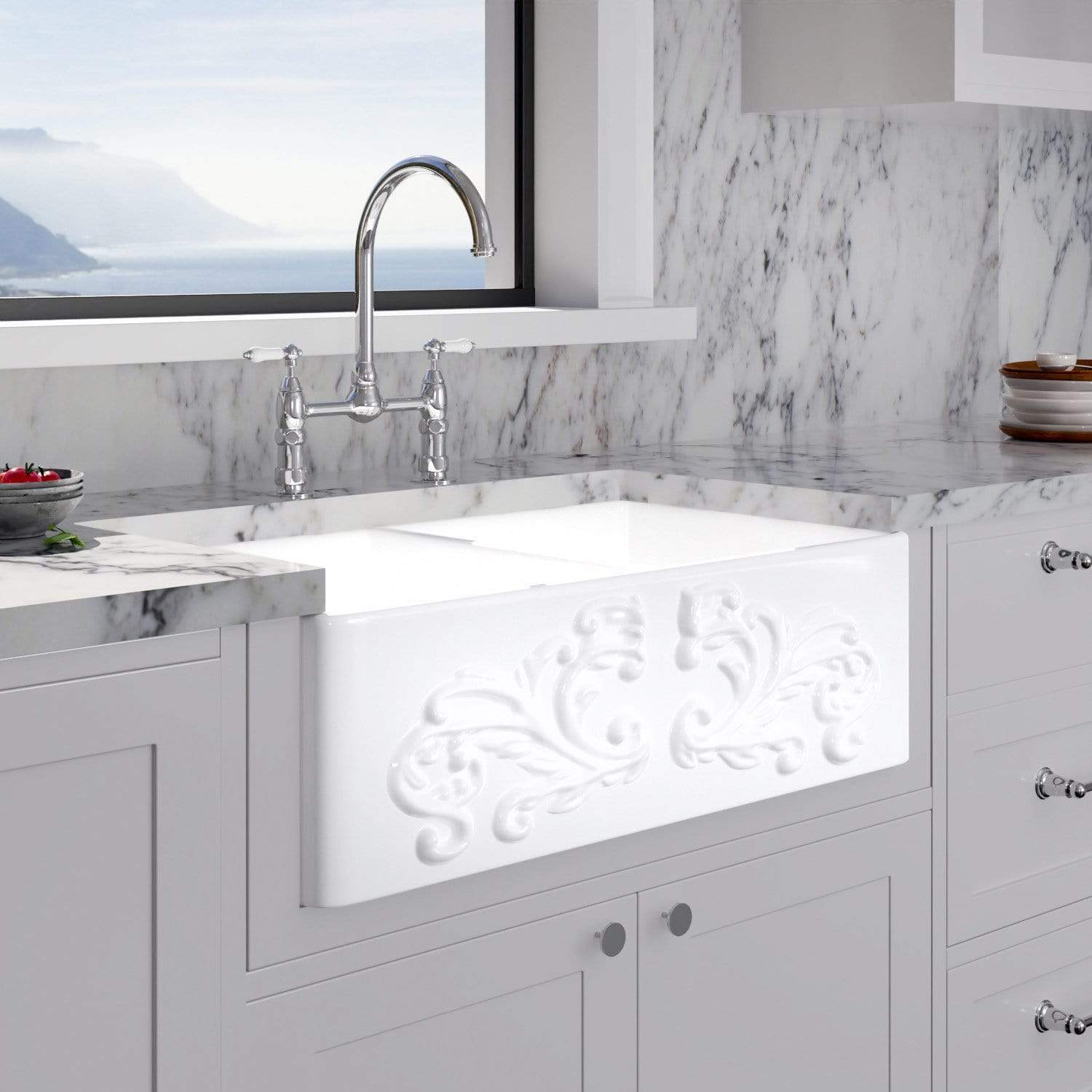 33" Una Handcrafted Fireclay Double-Bowl Foliage Apron Farmhouse B-Grade Sink - White