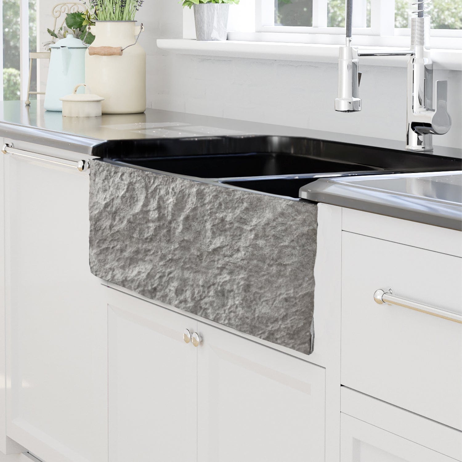 (833) 482-6828This stunning sink combines the natural beauty of stone with artisan craftsmanship, offering a unique and robust fixture for your home. Crafted from high-quality black granite, this sink boasts exceptional durability and a striking visual appeal. The 30" Buford Polished Black Granite Single-Bowl Farmhouse Sink - Chiseled Apron is a sophisticated choice for those looking to make a dramatic impact in their kitchen with a sink that combines natural beauty with lasting durability.