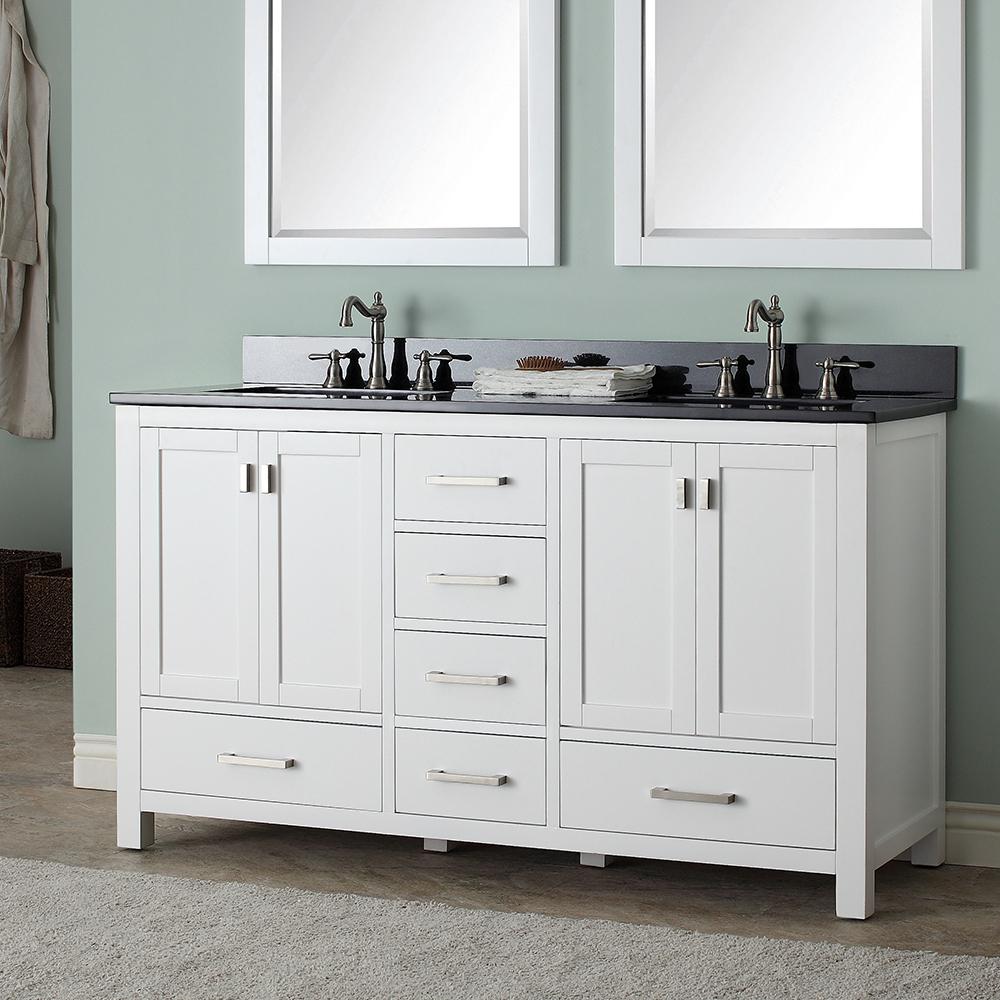 (833) 482-6828The milk-white finish of this double vanity cabinet will revive an old bathroom or aid a new one in differentiating itself from others. Beyond the color and design, the product shines from a quality perspective with its solid poplar frame and soft-close doors.
