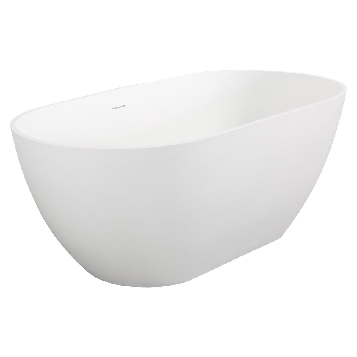 Wash away worries with a soak in our matte white 63" Sabin Solid Surface Stone Resin Freestanding Bathtub. The sleek, oval-shaped, modern curved tub with its agile and artistic lines creates a spa-like, immersive bathing experience that combines luxury with practicality and adds to the décor of any bathroom.