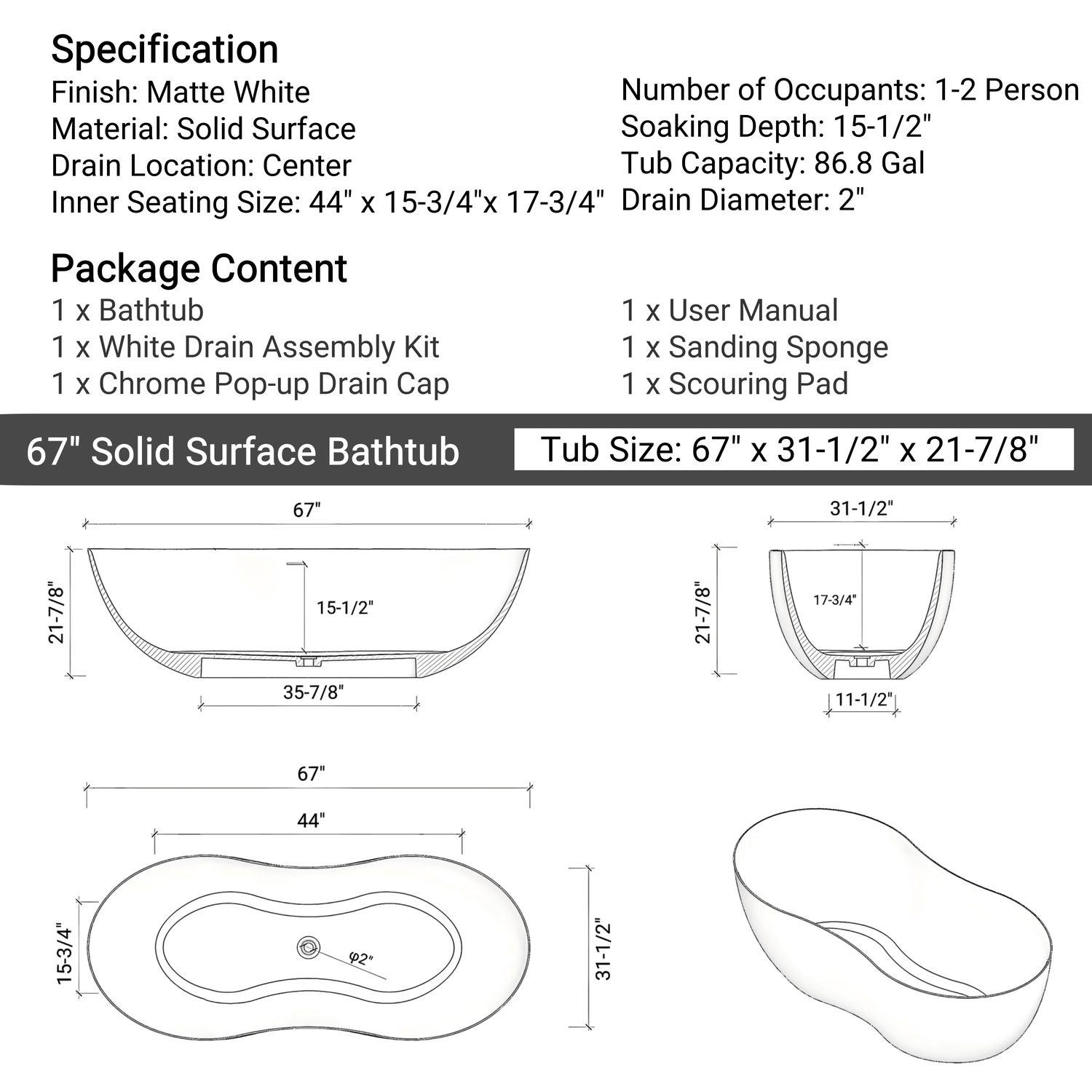 67" Civello Solid Surface Stone Resin Freestanding Bathtub