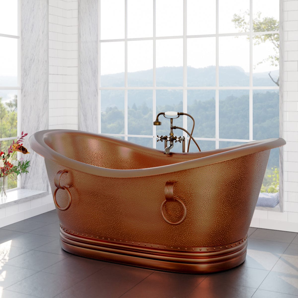 Both functional and decorative, this Extra Wide copper double-slipper tub should become a signature part of most remodeling jobs. The tub includes a decorative platform, a fashionable stripe of rivets and a set of round rings to spruce-up the exterior.
