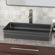 The pitch black finish and decorative outside design of this vitreous china vessel sink ensures the item will become a primary focus of any bathroom. The long basin and rather low profile means the sink offers plenty of washing room while also working with most vessel faucets.
