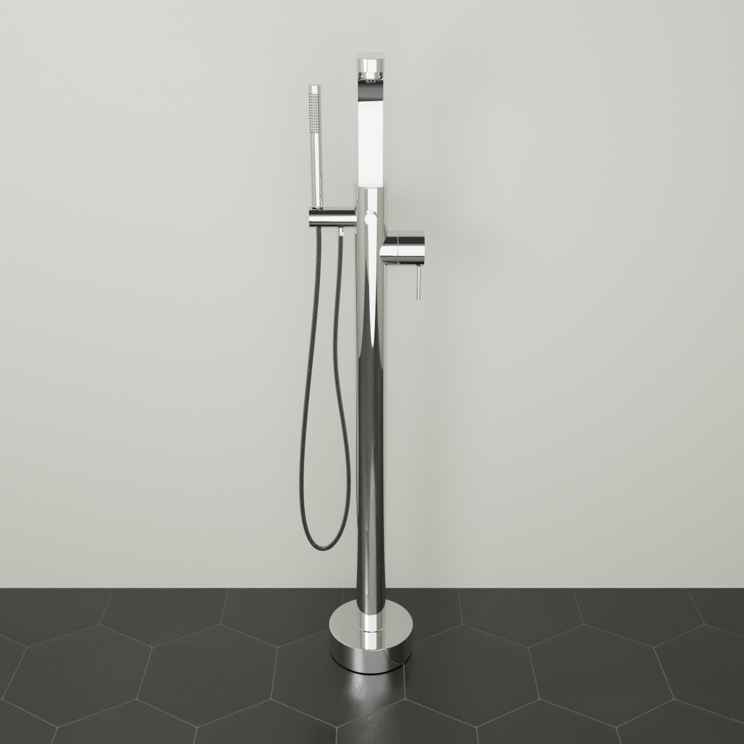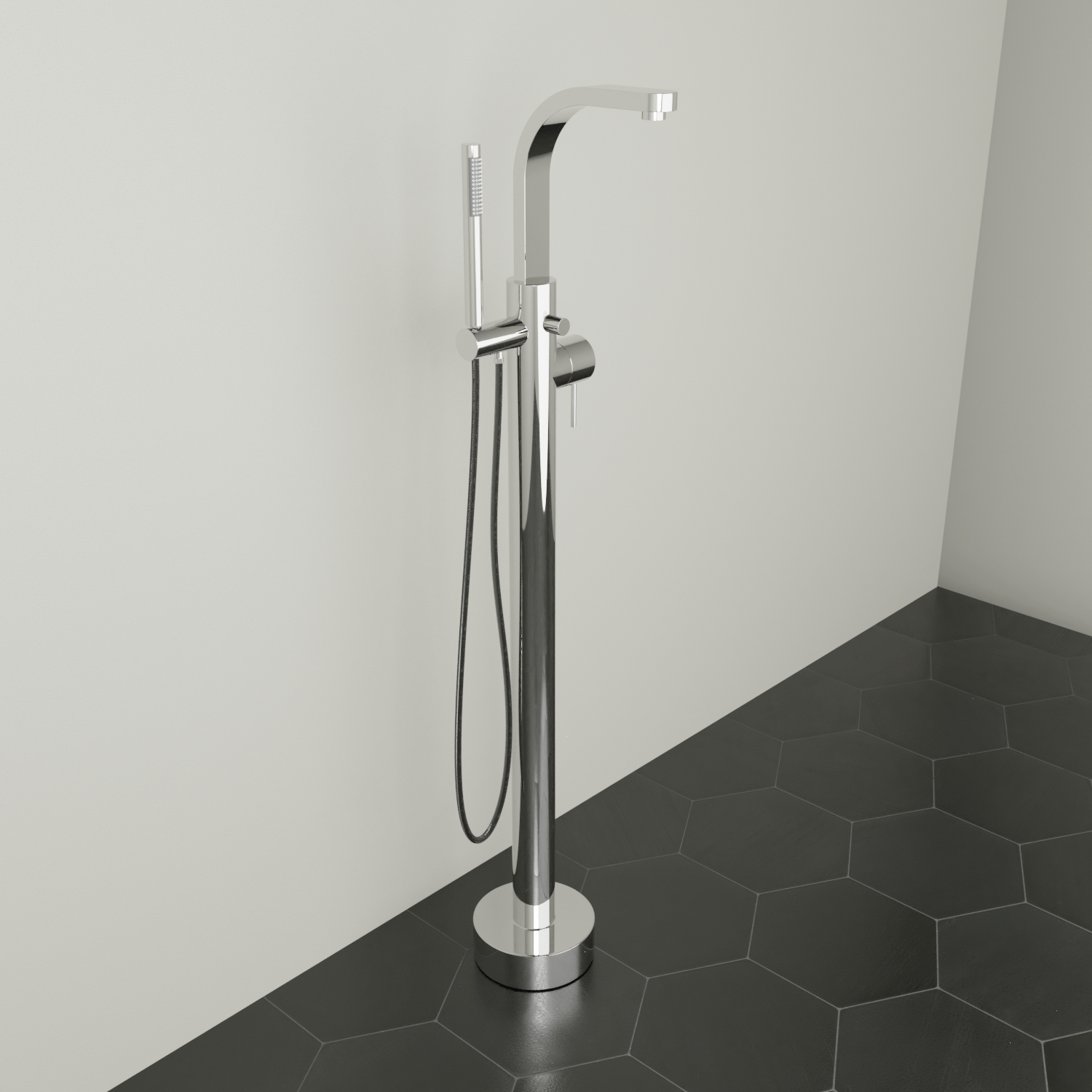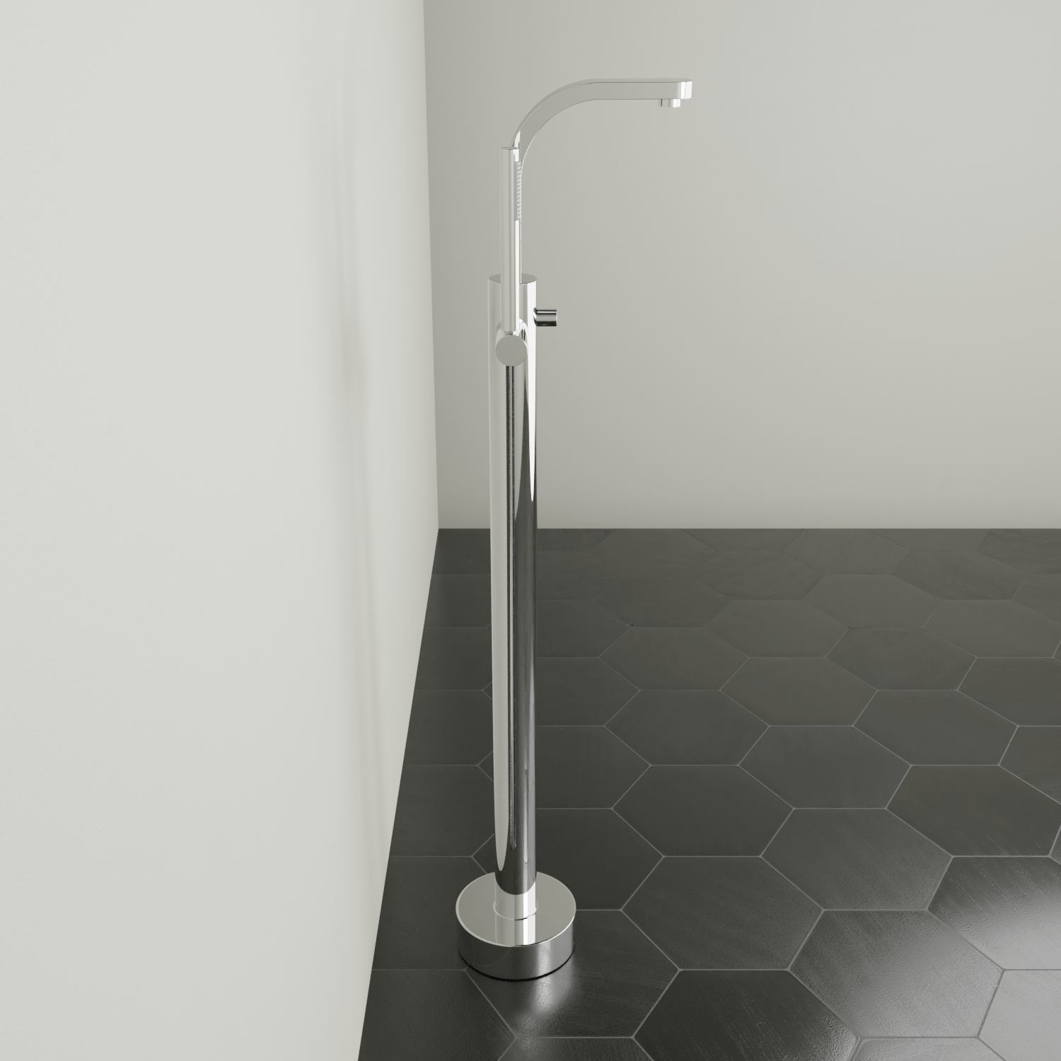 Cylindrical and angular parts work concurrently to form this unmistakable freestanding bathtub faucet. Sourced from solid brass and other fine parts, this unit includes a hand shower and zinc handle.