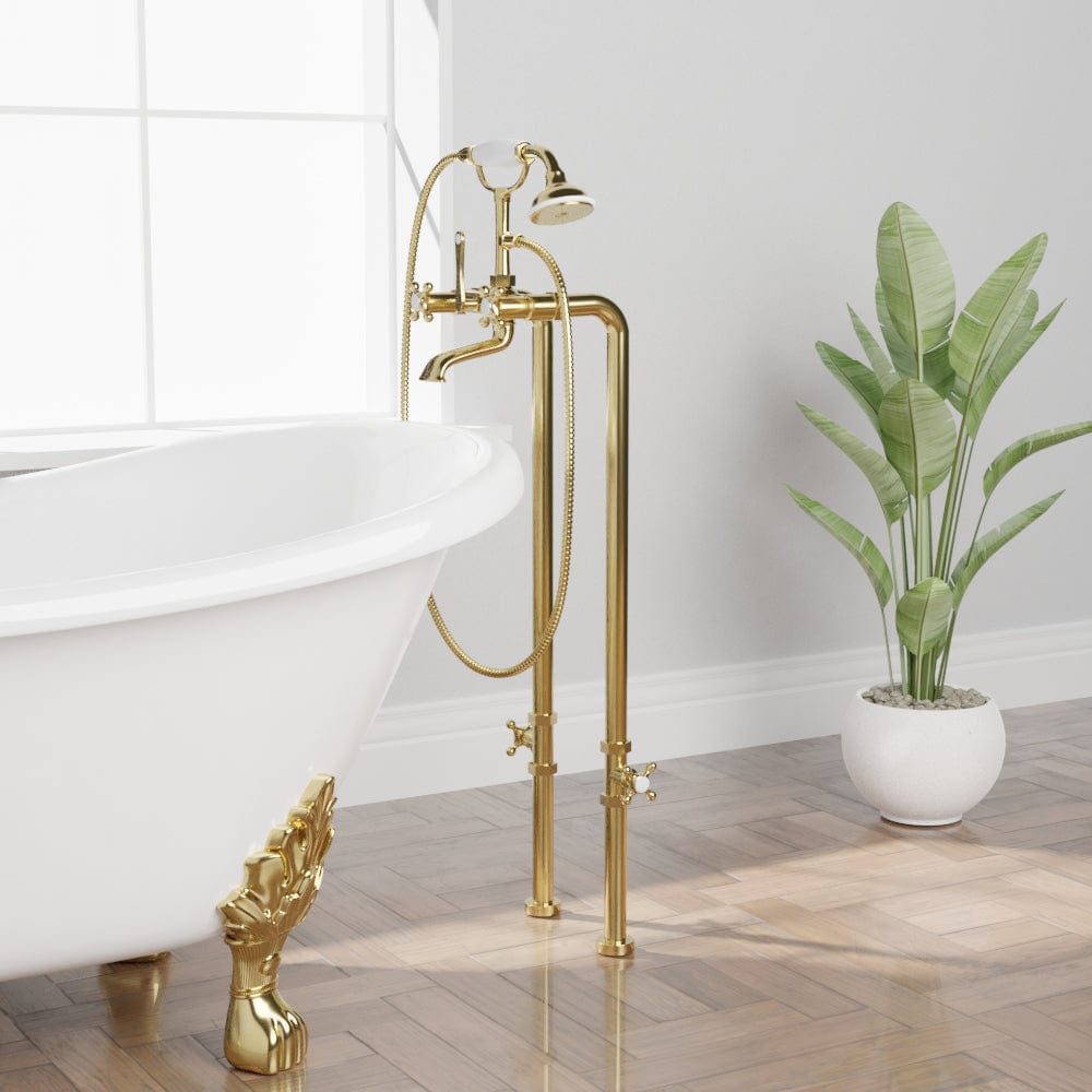 (833) 482-6828The heavy-duty craftsmanship and focus on detail differentiate this freestanding tub faucet from most varieties. An old-fashioned telephone hand shower, diverter and striking porcelain cross handles are included, along with several height options to accommodate different tubs.