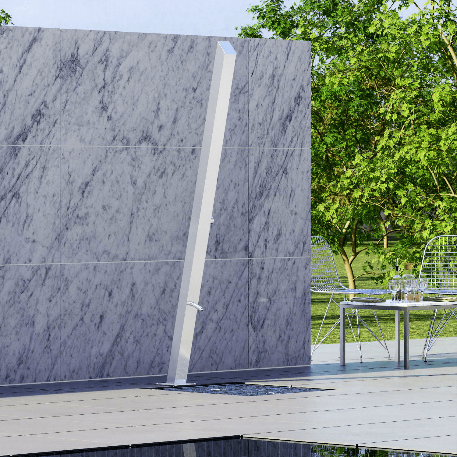 (833) 482-6828This freestanding stainless steel outdoor shower is well-suited for poolside settings and various outdoor environments. It seamlessly blends functionality and aesthetics. Its robust construction incorporates a brass diverter and a convenient foot shower, offering swift removal of sand and other debris.