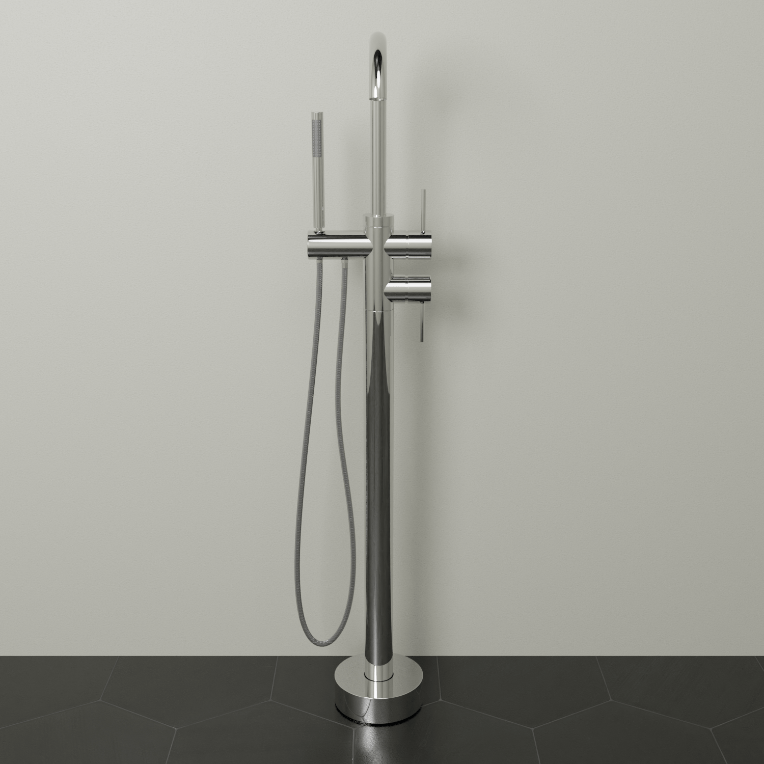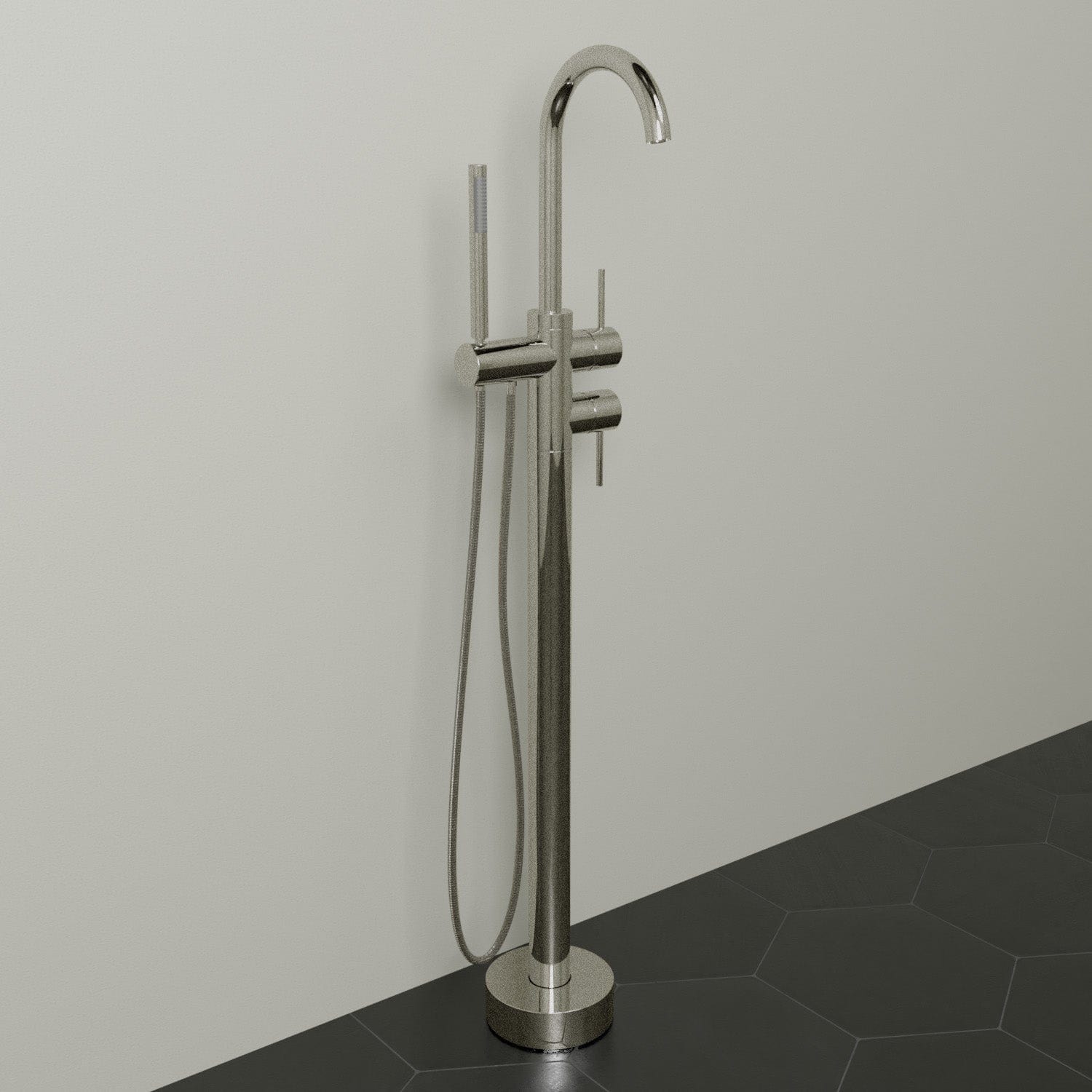 Spectacularly built and a classic example of contemporary design, this floor-mount tub filler will refine your master suite. Two control handles allow you to easily switch between the faucet spout and hand shower, which extends almost 60" for user-friendly bathing.
