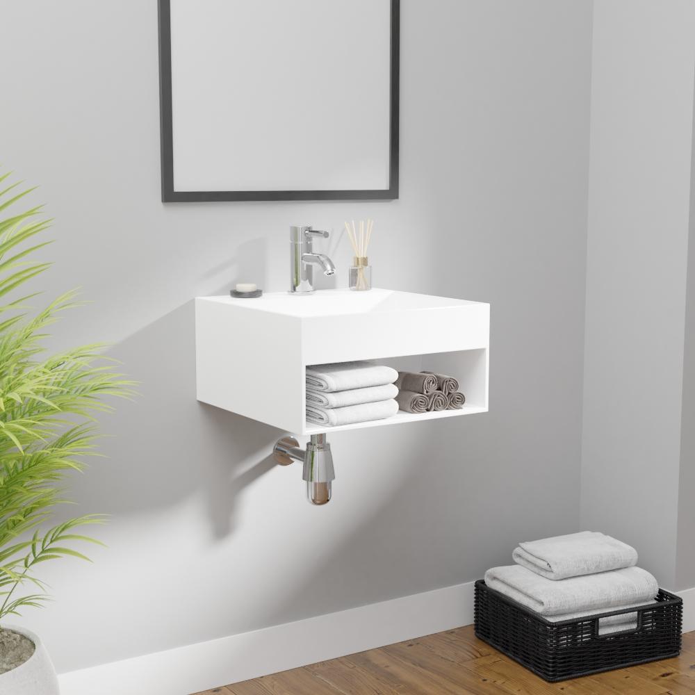 Between the unimpeachable resin construction and the convenient buit-in shelf, this resin wall-mount bathroom sink should meet or exceed even great expectations. Select from either a gloss or matte finish based on the surroundings.
