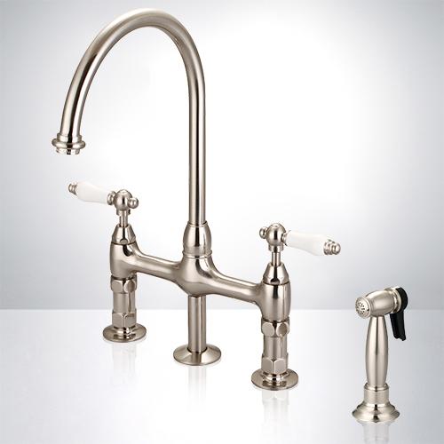(833) 482-6828The gooseneck spout of this kitchen faucet aligns well stylistically with the bridge-style base. A solid brass sprayer and hose lets you focus on cleaning normally awkward corners and dishware.